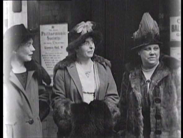 Die großen Führer der Parteien posierten gerade für die Wochenschaukameras, als die Women’s Social and Political Union (WSPU) die Bühne der Queen’s Hall betrat, um über die Frage von weiblichen Parlamentsmitgliedern zu diskutieren. Wir sehen Emmeline (Mrs.) Pankhurst, ihre Tochter Christabel, Flora „Der General“ Drummond und Angie Kenney, die einzige aus der Arbeiterklasse stammende Suffragette, die in die Führungsspitze der Partei aufsteigen sollte. (Jez Stewart, Make More Noise! Suffragettes in Silent Film)